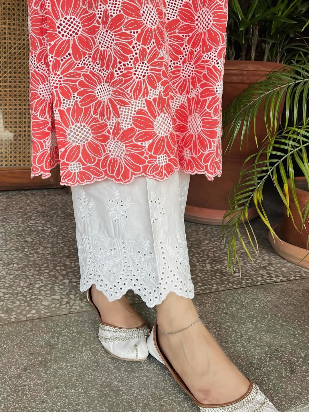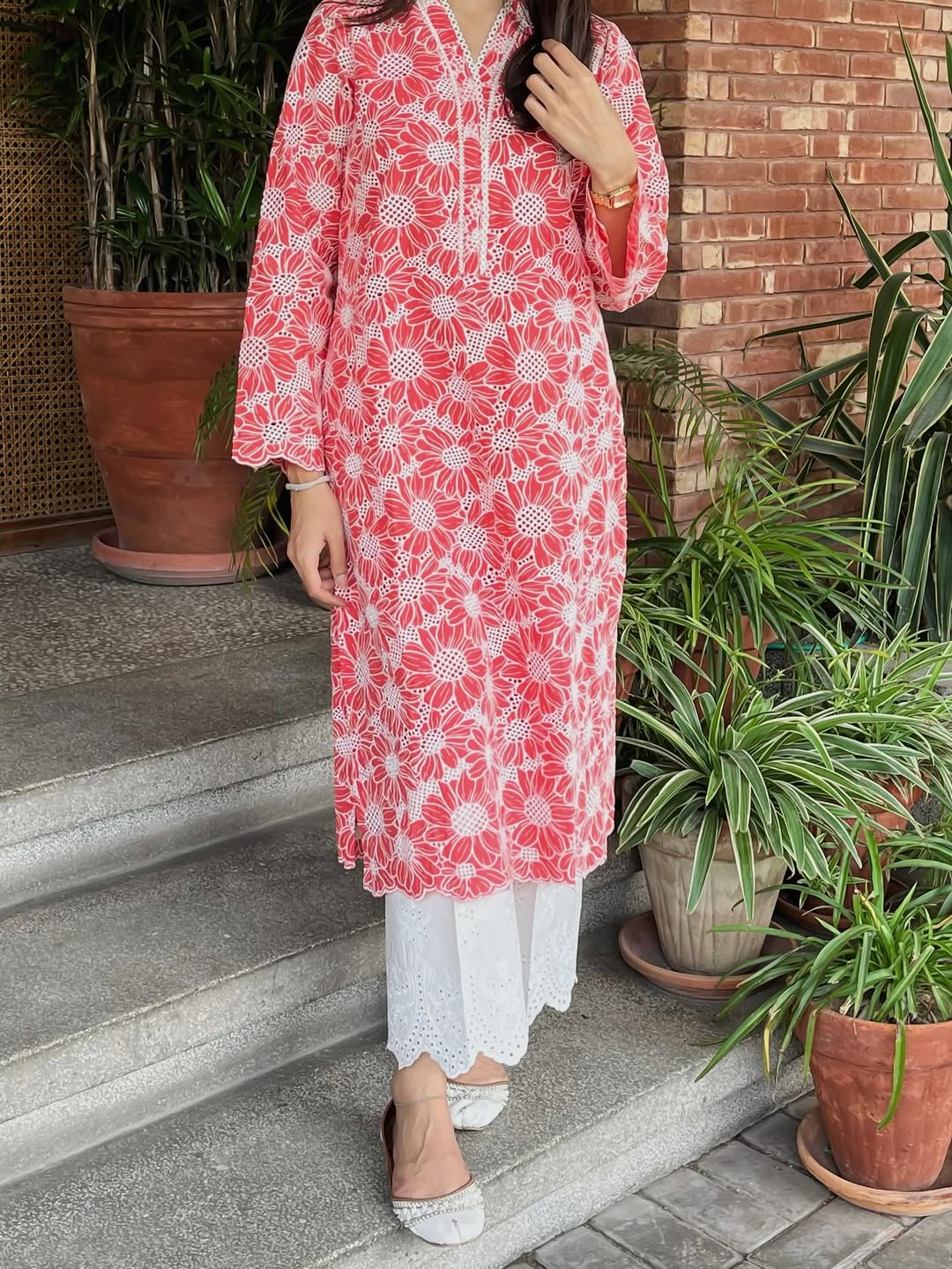 Step into elegance with this stunning Pink Embroidered 2-Piece Suit, paired with a classic white palazzo-style trouser. Designed with flower-shaped chicken kari embroidery, this outfit blends soft feminine charm with modern summer comfort. The lace-detailed neckline adds a refined touch, making it perfect for seasonal wear, day events, and chic casual outings.